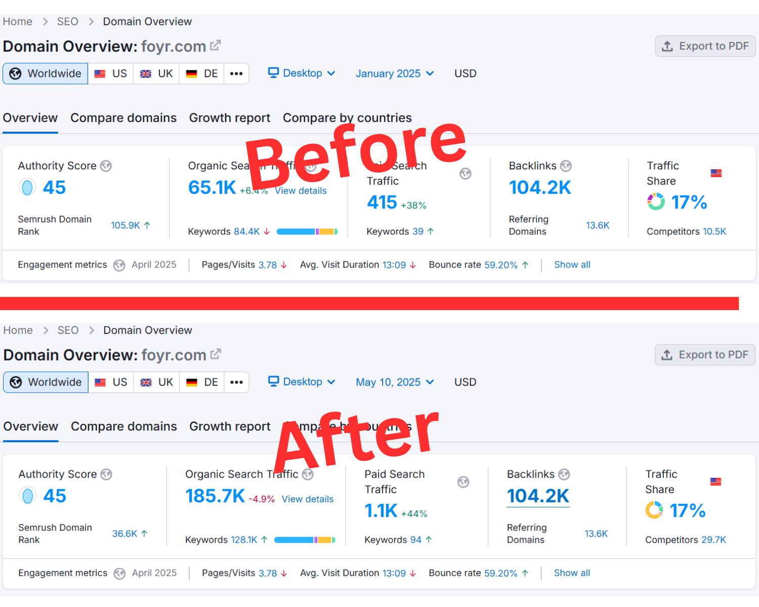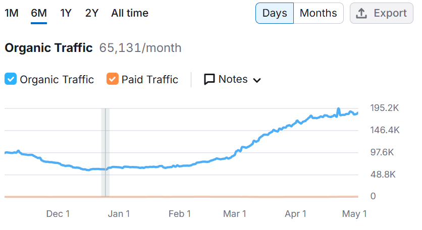 In just three months, we helped Foyr.com recover from a significant drop in organic traffic. By focusing on targeted on-page SEO improvements and building high-quality backlinks, we were able to increase their traffic by over 185%, bringing their organic visitors back to more than 185K per month, with a clear upward trajectory toward even more growth. This case study demonstrates the power of a structured SEO strategy, combining content optimization and link-building efforts to achieve lasting improvements.